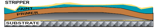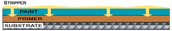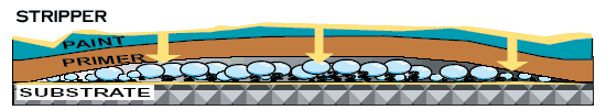 Once the product has been applied to a painted surface, the active ingredients start traveling down through the paint. They open the pores of the paint, allowing the product to penetrate all the way down to the substrate. When these ingredients have reached the substrate, an internal chemical reaction takes place by which oxygen gas is released from within the chemical remover. The bond between the coating system and the substrate is destabilized and the pressure created by the oxygen breaks that bond completely and releases the paint from the surface.